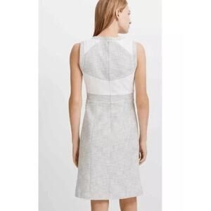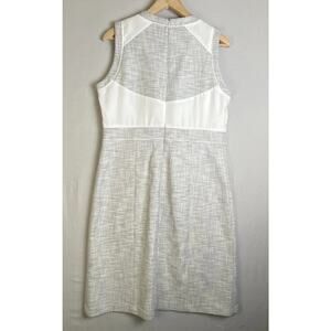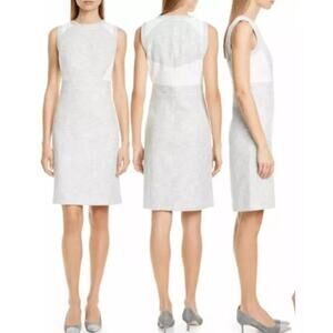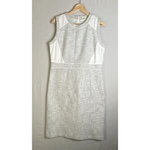 Featuring a round neckline, sleeveless silhouette, and a tailored sheath fit. Back zip closure for a clean finish. Knee-length design in a light grey and white palette for versatile styling. Streamlined construction suited for day-to-night wear. Fits true to size