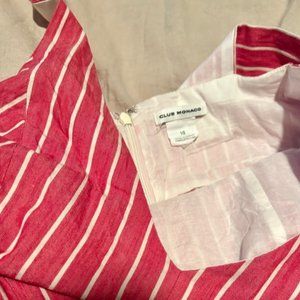 Stylish pink jumpsuit with white stripes. Features a flattering tie waist. Sleeveless design for a chic look.