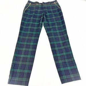 Club Monaco Plaid Patterned Straight Leg Green Slack Pants Leather Banded Size 4