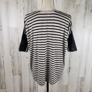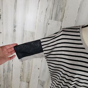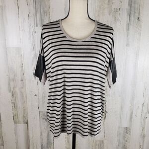 ~ Description: Black and gray striped tee, leather patches on sleeves, slouchy drop shoulder, stretchy knit material