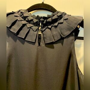 This season’s Club Monaco 100% black silk flowy top. Ruffled neck in front and back, with covered buttons, fully lined. Super sexy and works well for dressy or casual with jeans. See attached pics for sizing. EXCELLENT CONDITION