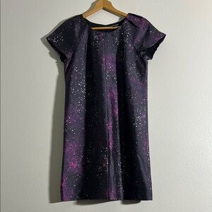 Shift dress, zipper at back of neck, cap sleeves, roomy fit.