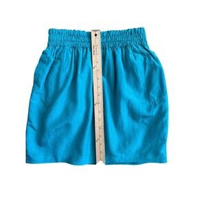 This is a Club Monaco mini skirt for women in size XS. It is made of a blend of 58% cotton and 42% silk in a turquoise color. The skirt features a pleated design, an elastic waist with pockets, and is lined. It has a pull-on closure and is suitable for various occasions such as parties, travel, and casual or business settings. Perfect for a stylish and comfortable look in the summer, fall, or spring seasons.