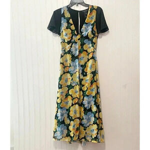 Club Monaco Size 4 Black Yellow Coran Floral Flutter-Sleeve Midi Dress NEW!