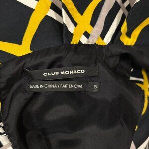 This sleeveless geometric dress by Club Monaco features a sophisticated high neck design. Crafted from a cotton-rayon blend, it offers lightweight comfort with a striking black, yellow, and white pattern. Ideal for professional settings or refined casual occasions.