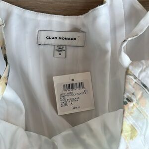 Scoop neck; adjustable shoulder straps; pintucked bodice; self-belt; pleated full skirt