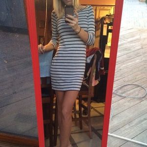 Practically brand new, Club Monaco light grey & navy striped casual dress. Extremely comfortable and can be worn many different ways. Scoop back & 3/4 length sleeves. There's no size tag, but I'm positive it's a small. Belt not included, just modeled to show how I styled it the one time I wore it. No tears, rips, stains or pulls. Damage free. I'm 5'3" for reference, and 110 lbs. Looser fit without the belt. Adding additional pictures in separate post. Pictures just don't do it justice!😍
