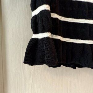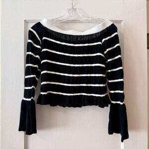 With a cropped fit and ruffled finish for a fresh take on stripes. Wear with all things high-waisted. Ruffle cuffs and hem. Off-shoulder neckline. Long sleeves. Loose thread on the side toward bottom of the sweater (see photo), not very noticeable when worn.