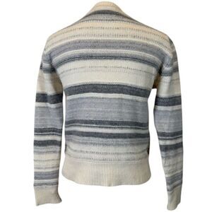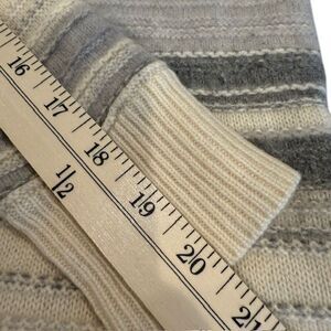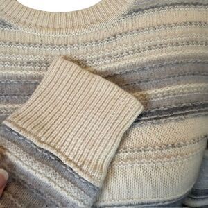 Stylish crew neck sweater. Features cream and gray stripes. Perfect for casual wear.