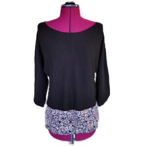 Club Monaco design sample, size S, black Merino wool sweater with black, pink, and blue abstract watercolor silk shirt tail hem. Wool is lightweight and soft. 3/4 length subtle dolman sleeves. Boxy silhouette. Silk shirt tail has a split hem at either hip. Loose fit. Boat Neck. New Without Tags.