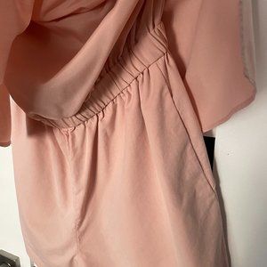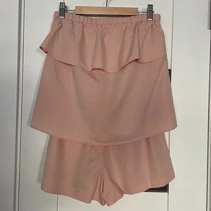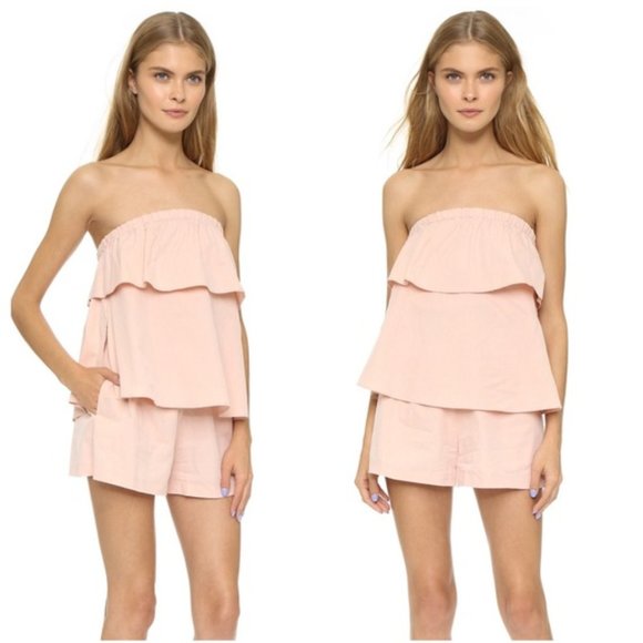 Tiered ruffled strapless romper. Covered elastic top hen and waist. Slant hip pockets.