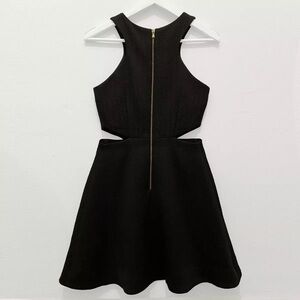 Club Monaco 'Tika' a-line mini dress features flattering side cut-outs at waist, a high neckline and fitted bodice with darts. Flared, a-line shaped skirt and exposed gold zipper at center back for closure.