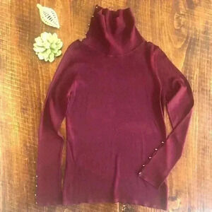 Nice pre-worn condition, no flaws to note. (Dry cleaning sticker over tag) Pretty cranberry color - most accurate in last photo. Small gold-tone buttons on sleeve cuffs and up the side of the turtleneck. Great holiday sweater!