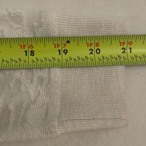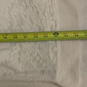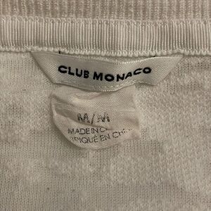 White, knit, burnout, scoop neck, long sleeve, pullover shirt by Club Monaco in a women's size medium. There is no care tag so I'm not sure if the top is cotton or a blend. Rib knit on neck, cuffs and waist. In good pre-owned condition with some signs of wear from normal use.