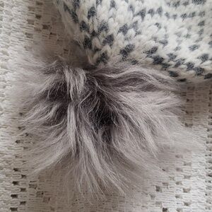 Club Monaco winter hat Extremely warm and attractive, pom poms, ear flaps gray and creamy white pattern. 37% Angora, 30% nylon, 13% lambswool, 3% cashmere. pom poms are rabbit.