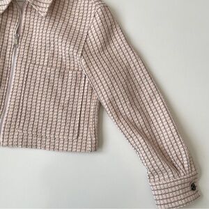 Think outside of the box. A unique crop jacket woven with a grid pattern and designed with a single oversized pocket for that extra it factor. The casual silhouette is elevated by its elegant fabrication.