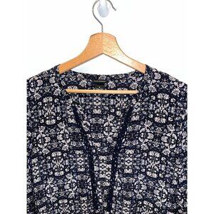 This Club Monaco dress showcases a sophisticated floral pattern in navy and white. The long sleeves and elegant design make it suitable for professional settings. Crafted with attention to detail, this dress is ideal for a refined wardrobe.