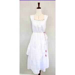 New with tags Club Monaco Women's Boutone Robe Dress in size M. Dreamy white with a romantic ruffled waist, tassel ties, and soft textured cotton and rainbow beaded trim – a Pinterest-perfect pick for spring, summer, bridal showers, Mother's Day brunches, vacations, festivals like Coachella, and even casual beach weddings. Light and breathable, it’s giving "Whimsigothic" meets "coquette cottagecore" vibes – exactly what Pinterest Predicts 2025 trends are leaning into!