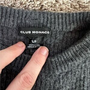 This soft gray sweater by Club Monaco is 100% Merino Wool. The perfect textile for the chilly Fall and Winter months. The chic, dark gray color makes it something that can be dressed up for special occasions, holiday parties, family photos or the office, or paired down with a dark Jean for a more casual look.