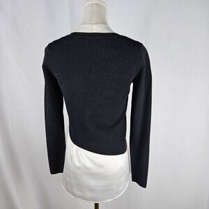 tags....club monaco top, black and white, long sleeve top, casual top, professional attire, XS top, tailored top, monochrome fashion, modern design, chic top, office wear, business top, professional top, city top, designer top, layered top, over under top,