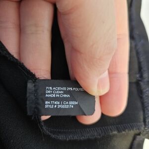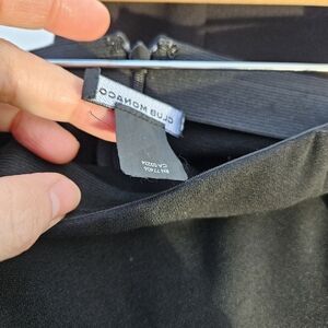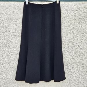 Black midi-length skirt in a bit of a flowy style. Relatively modest. Zips up the back for easy on/off.