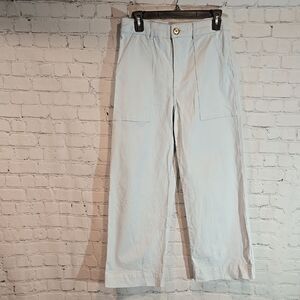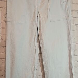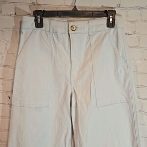 In excellent used condition no flaws. Super light blue with large front and back pockets. Denim weight with double button and zippered closure