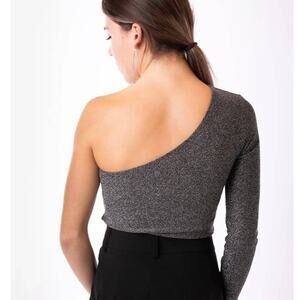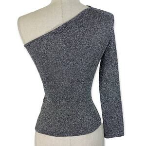 Club Monaco black silver metallic one shoulder top. Excellent pre owned condition, no notable flaws. Rayon polyester metallic knit has a little stretch. Pullover. Shimmery top is perfect for cocktail parties, holidays, clubwear, date night