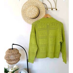 It features a lovely pointelle stitch design and a comfortable oversized fit. The vibrant green color is sure to brighten up your day. Perfect for layering or wearing on its own, this sweater is a versatile addition to your wardrobe.