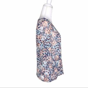 Club Monaco 100% silk print top sheer blouse. Navy blue, light blue, peach allover abstract print. Wide, round neck, 3/4 sleeves, front pockets. A perfect spring piece! Excellent used condition: no stains, holes, or pills.