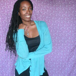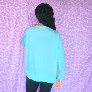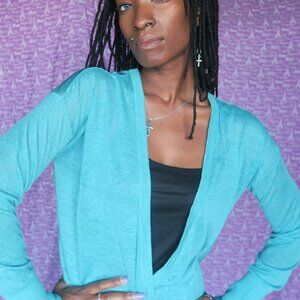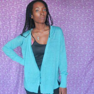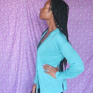 Club Monaco style 00500831 sheer blouse long sleeve silk linen cardigan in turquoise blue. No size however, it seems it can fit a small to large.