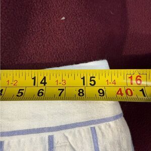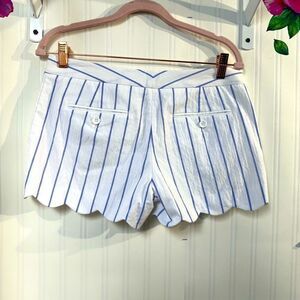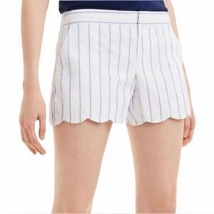 These high-waisted shorts from Club Monaco feature a sophisticated white and blue pinstripe pattern, offering a blend of elegance and playfulness. The scalloped hem adds a decorative touch, making them perfect for both formal and business-casual settings. Crafted from a crisp, structured fabric, they provide a tailored fit that flatters the silhouette.