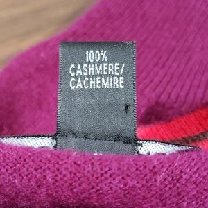 A classic sweater by Club Monaco in 100% cashmere. Its a nice plum color with red & brown accents on the inside of the neckline, and brown accents on the outside of the shoulders. Ribbed sleeve cuffs & waist.