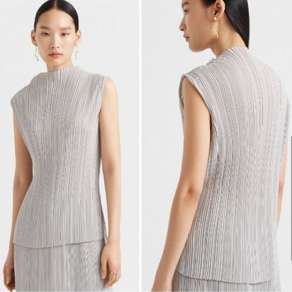NEW Club Monaco Micro Pleat Chemise Blouse/Top. Color is Blue, but has a grayish hue to it. Can be worn with a skinny belt, adds a flattering style to it. (Center may be slightly cinched/creased in due to a belt being in center as a store display) Nothing wrong with it, will wash out, just mentioning.