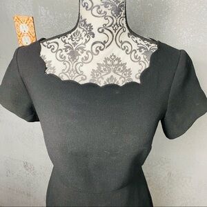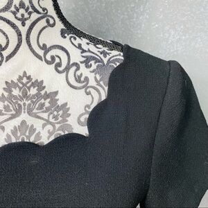 Round neckline with scalloped edging; scalloped details at waist and hem; short sleeves; concealed back zip with hook-and-eye closure