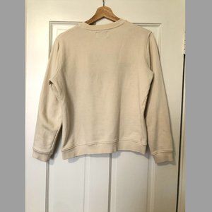 Off-white sweatshirt from Club Pétanque's collab with Madewell, size S. A few spots of slight discoloration (see photos)--I honestly didn't notice these until I was carefully looking the sweatshirt over to post, so I feel safe saying it's not very noticeable day to day. May be fixed with a good wash using Shout :) Additionally, there is a spot where the cuff meets the sleeve, where a few of the threads seem to have started to come loose. See close-up photo of sleeve & cuff. See fourth photo (close-up of material) for a truer color (it's more of a cream, less yellow than it appears in my other photos)