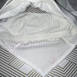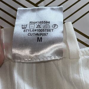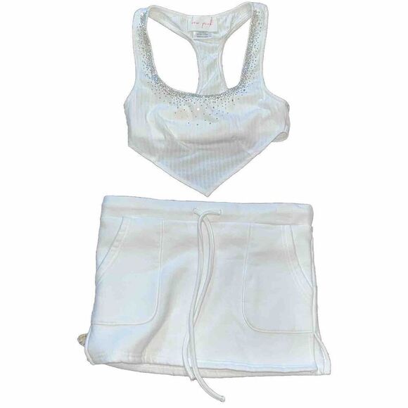 Fleece lining in skirt, built in bra in top. Some light staining from tie dye on the white top, adds to the aesthetic. This is a two-piece outfit set for women, perfect for dance parties and festivals. The set includes a white crop tank top and a mini skirt, both made of polyester and cotton. The top has a scoop neck and bling details, while the skirt is solid and pullover. The outfit is designed for summer and features a festival theme. It is made by the brand New Pink and is available in size M for regular size women.