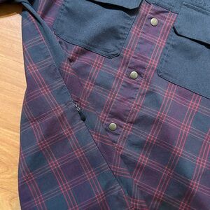 Bike button-up men’s shirt with subtle plaid accents. Features a classic collar and button details, elbow patches, and Leadville cycle shop logo.