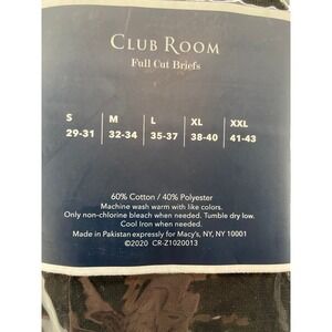 This listing is for a new with tags Club Room 8-Pack Men's XL Full Cut Briefs in Black. Tagless, No-Ride Up, Solid Tone Waistband. 60% Cotton, 40% Polyester, Machine Washable.