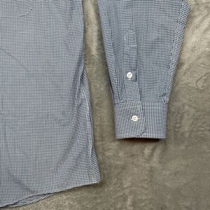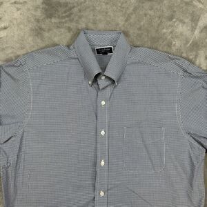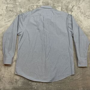 This is a men's Club Room button-down shirt in size 16.5 with long sleeves and a collared neckline. It is blue in color and made of cotton with a woven fabric type. The shirt features a button closure, button-down collar, and has a regular fit. It is designed for easy care and has pockets, suitable for a classic and dad-themed look.