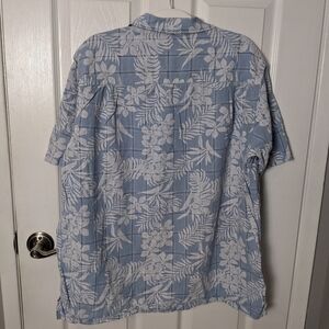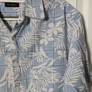 Blue, White, Linen, Cotton, Casual, Button Down, Button Up, Travel, Vacation, Floral, Leaves, Pocket, Club Room, Foliage, Size Large, Size L, Men's, Men, Man, Checkered, Lightweight, Palm Fronds, Tropical, Short Sleeve, Comfy, Comfortable, Club Room, Top, Shirt