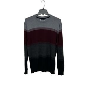 Club Room Mens LG Crew Neck Sweater Gray/Burgandy Lightweight Merino Wool Blend