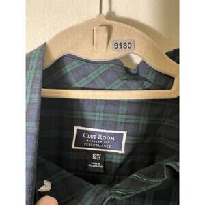 Club Room Mens Regular Fit Performance Button Up Navy and Green Plaid Shirt Sz 17.5, 36/37