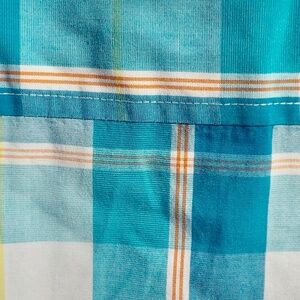 A variety of vibrant colors make this shirt a stand out (blues, orange, yellow, and white).