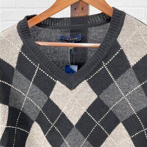 Elevate your wardrobe with this classic Club Room sweater, perfect for any occasion. The gray, black, and ivory argyle/diamond pattern on a tight-knit lambswool fabric makes it a classic and preppy choice for a party, cocktail event, casual outing, or business meeting. The relaxed fit and collarless design add comfort and style, while the V-neckline and long sleeves keep it appropriate for the winter, fall, and spring seasons. This sweater is dry clean only and is available in XL size.
