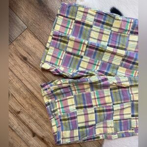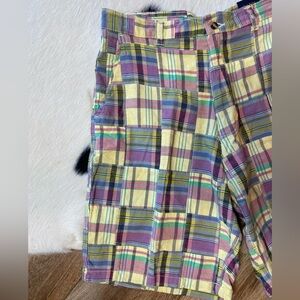 Club Room men's plaid shorts, characterized by their patchwork plaid pattern in shades of yellow, purple, blue, and green.