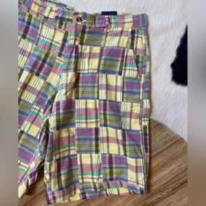 Club Room men's plaid shorts, characterized by their patchwork plaid pattern in shades of yellow, purple, blue, and green.