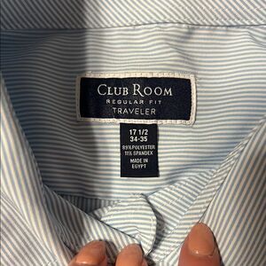 This Club Room dress shirt in a light blue and white stripe hue offers a timeless and sophisticated look. Crafted for both business and casual settings, it features a classic collar and a comfortable fit. Ideal for elevating your wardrobe with a touch of elegance.