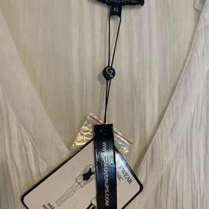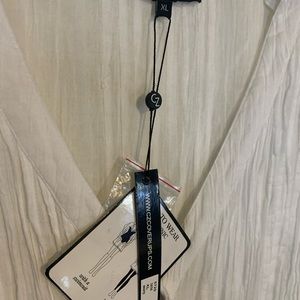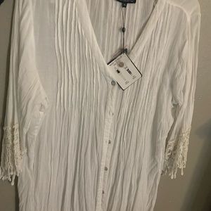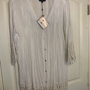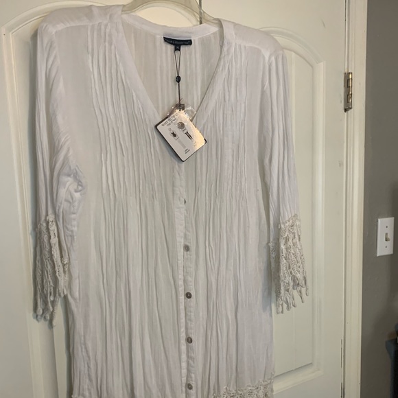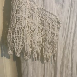 Cotton tunic with crochet sleeves and bottom. Can be worn as a bathing suit cover or a blouse. Very pretty and soft.