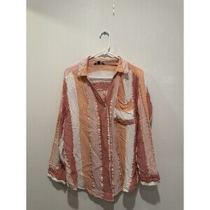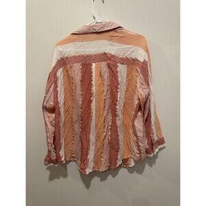 A Club Z Collection Metallic Vertical Striped Button Down Top in size 1X for women, featuring a collared neckline, long sleeves, and metallic accents. This pink top has a breathable, easy-care fabric suitable for all seasons and occasions such as travel, parties, or casual wear. The top has a classic button closure and a stylish striped pattern, making it a versatile addition to your wardrobe. 110a