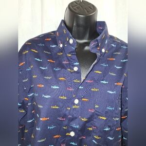 Club room medium button-down fish print pit to pit size is 23" top of shoulder to bottom hem is 27.5 " if you have any questions please message me bundle more items for bigger deals Bin-109